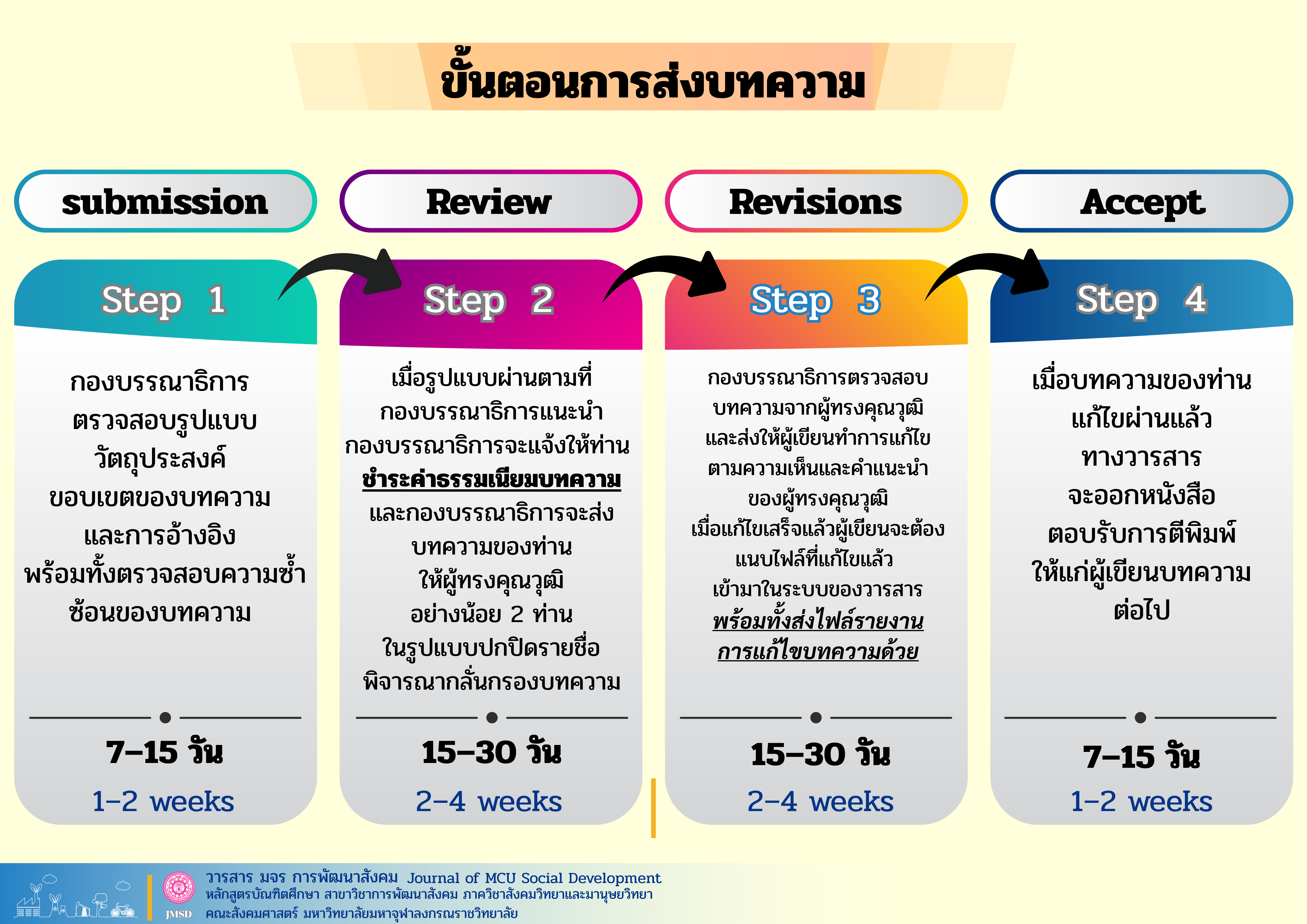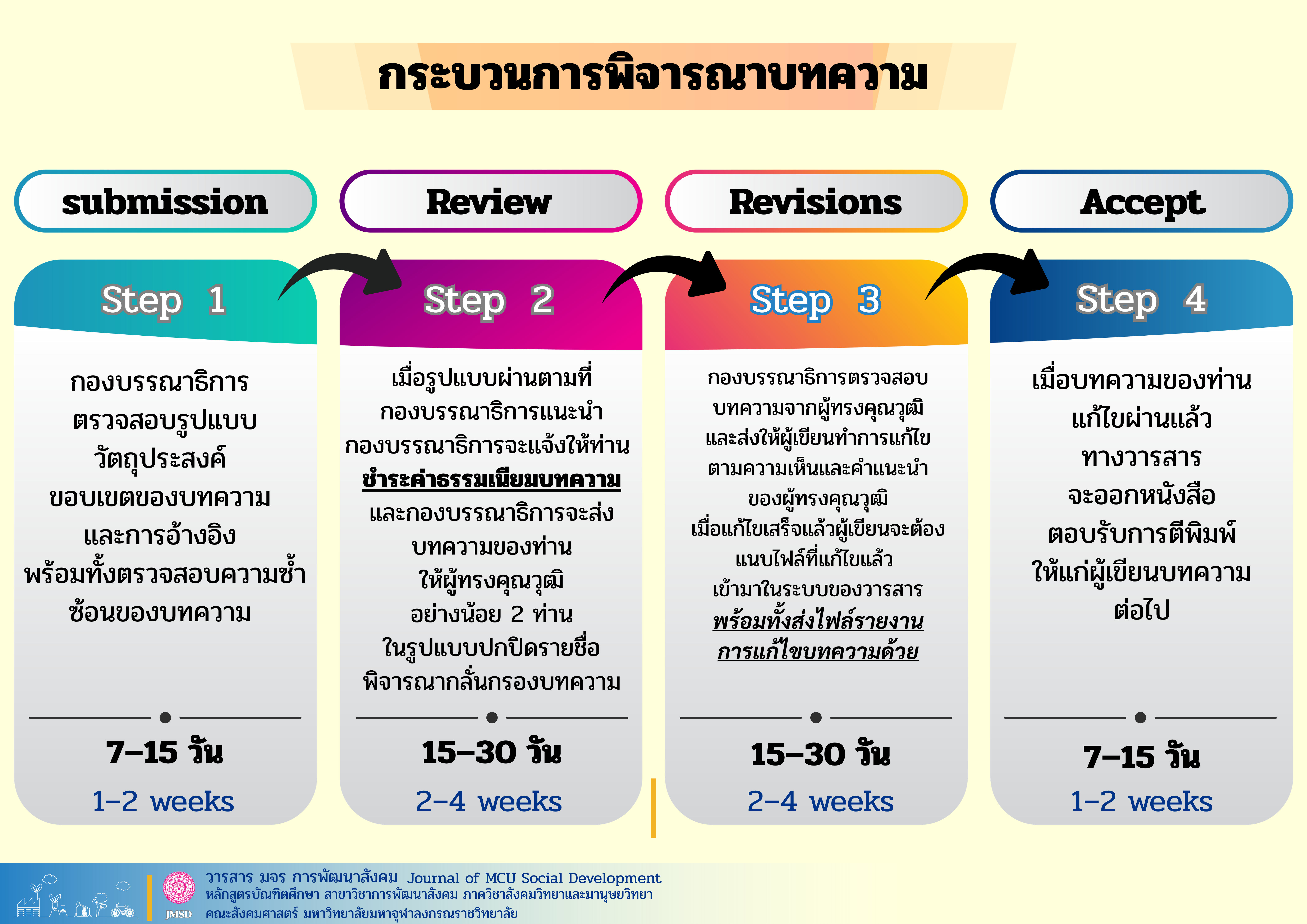 4. เนื้อหาบทความและองค์ประกอบของบทความต้องผ่านการตรวจพิจารณาและอนุมัติจากกองบรรณาธิการ เพื่อส่งให้ผู้ทรงคุณวุฒิพิจารณาประเมินบทความ