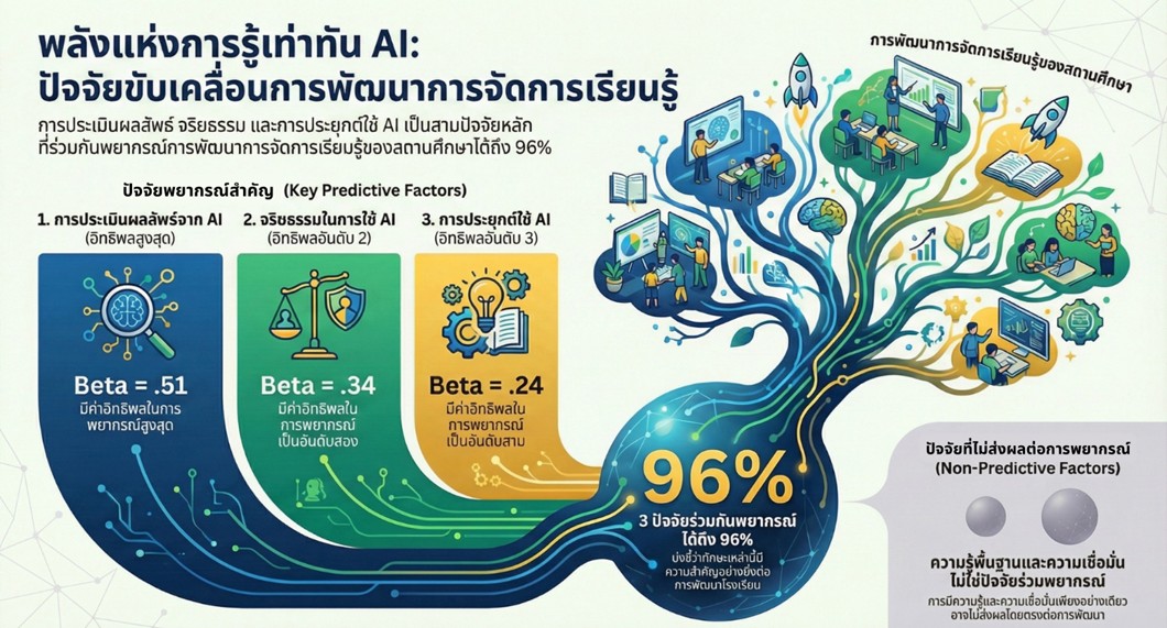 บทความวิจัยนี้มีวัตถุประสงค์เพื่อ 1) ศึกษาและเปรียบเทียบการรู้เท่าทันปัญญาประดิษฐ์ของผู้บริหารสถานศึกษา 2) ศึกษาและเปรียบเทียบการพัฒนาการจัดการเรียนรู้ของสถานศึกษา 3) ศึกษาความสัมพันธ์ระหว่างการรู้เท่าทันปัญญาประดิษฐ์ของผู้บริหารสถานศึกษากับการพัฒนาการจัดการเรียนรู้ของสถานศึกษา 4) ศึกษาอำนาจพยากรณ์ของการรู้เท่าทันปัญญาประดิษฐ์ของผู้บริหารสถานศึกษาที่ส่งผลต่อการพัฒนาการจัดการเรียนรู้ของสถานศึกษา สังกัดสำนักงานเขตพื้นที่การศึกษาประถมศึกษานครพนม เขต 1 กลุ่มตัวอย่างทั้งหมด 260 คน ได้แก่ ผู้บริหารสถานศึกษา 90 คน และครู 170 คน กำหนดขนาดกลุ่มตัวอย่าง โดยใช้เกณฑ์ร้อยละ ทำการสุ่มแบบแบ่งชั้น เครื่องมือที่ใช้ในการวิจัยเป็นแบบสอบถามมาตราส่วนประมาณค่า 5 ระดับ จำแนกเป็น 2 ฉบับ คือ (1) แบบสอบถามการรู้เท่าทันปัญญาประดิษฐ์ของผู้บริหารสถานศึกษา มีค่าดัชนีความสอดคล้อง .60-1.00 ค่าอำนาจจำแนกรายข้อ .60-.91 ค่าความเชื่อมั่นทั้งฉบับ .96 (2) แบบสอบถามการพัฒนาการจัดการเรียนรู้ของสถานศึกษา มีค่าดัชนีความสอดคล้อง .60-1.00 ค่าอำนาจจำแนกรายข้อ .29-.88 ค่าความเชื่อมั่นทั้งฉบับ .97 สถิติที่ใช้ ได้แก่ ค่าเฉลี่ย ส่วนเบี่ยงเบนมาตรฐาน ร้อยละ การทดสอบสมมติฐานโดยใช้ค่าที การวิเคราะห์สหสัมพันธ์แบบเพียร์สัน การวิเคราะห์ความแปรปรวนทางเดียว และการวิเคราะห์การถดถอยพหุคูณแบบขั้นตอน ผลการวิจัยพบว่า 1) การรู้เท่าทันปัญญาประดิษฐ์ของผู้บริหารสถานศึกษาอยู่ในระดับมาก เปรียบเทียบตามสถานภาพและขนาดสถานศึกษา พบว่า โดยรวมและรายด้านไม่แตกต่างกัน 2) การพัฒนาการจัดการเรียนรู้ของสถานศึกษาอยู่ในระดับมาก เปรียบเทียบตามสถานภาพและขนาดสถานศึกษา พบว่า โดยรวมและรายด้านไม่แตกต่างกัน 3) การรู้เท่าทันปัญญาประดิษฐ์ของผู้บริหารสถานศึกษากับการพัฒนาการจัดการเรียนรู้ของสถานศึกษามีความสัมพันธ์กันทางบวก อย่างมีนัยสำคัญที่ระดับ .01 4) การรู้เท่าทันปัญญาประดิษฐ์ของผู้บริหารสถานศึกษาที่ส่งผลต่อการพัฒนาการจัดการเรียนรู้ของสถานศึกษา มี 3 ตัวแปร ได้แก่ ด้านการประเมินผลลัพธ์ที่เกิดจากการใช้ปัญญาประดิษฐ์ (X4) ด้านจริยธรรมในการใช้ปัญญาประดิษฐ์ (X2) และด้านการประยุกต์ใช้ปัญญาประดิษฐ์ (X1) ร่วมกันพยากรณ์ได้ร้อยละ 96
