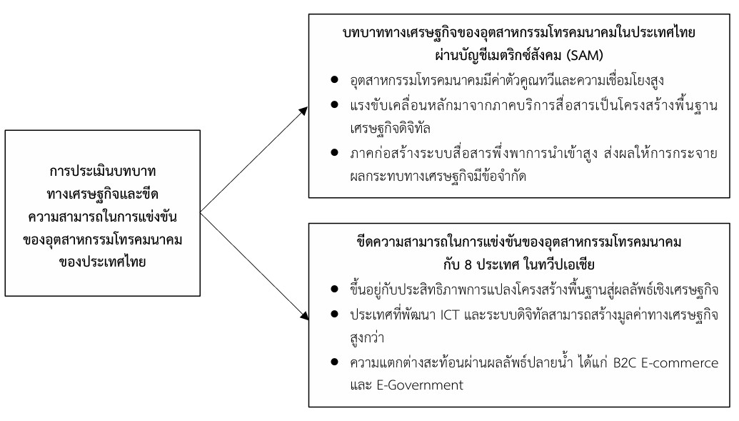 บทความวิจัยนี้มีวัตถุประสงค์เพื่อ 1) ประเมินบทบาททางเศรษฐกิจของอุตสาหกรรมโทรคมนาคมในประเทศไทยผ่านบัญชีเมตริกซ์สังคมของประเทศไทย พ.ศ. 2564 ที่ปรับปรุงให้เป็นปัจจุบัน เพื่อสะท้อนภาพรวมเศรษฐกิจ พ.ศ. 2567 และ 2) ประเมินและเปรียบเทียบขีดความสามารถในการแข่งขันของอุตสาหกรรมโทรคมนาคมของประเทศไทยกับ 8 ประเทศในทวีปเอเชีย ได้แก่ สิงคโปร์ มาเลเซีย อินโดนีเซีย ฟิลิปปินส์ เวียดนาม จีน ญี่ปุ่น และเกาหลีใต้ การวิจัยครั้งนี้เป็นการวิจัยแบบผสม โดยเครื่องมือที่ใช้วิเคราะห์เชิงปริมาณ คือ บัญชีเมตริกซ์สังคม และเชิงคุณภาพ คือ เทคนิคการจัดลำดับความสำคัญแบบการให้ค่าคะแนน เพื่อประเมินขีดความสามารถในการแข่งขันในองค์ประกอบต่าง ๆ ผลการศึกษา พบว่า 1) อุตสาหกรรมโทรคมนาคมของประเทศไทยในสาขาการก่อสร้างอาคารและระบบสื่อสาร มีค่าตัวคูณทวีด้านผลผลิต ด้านมูลค่าเพิ่ม และด้านรายได้ เท่ากับ 3.83 1.39 และ 1.27 ตามลำดับ และสาขาบริการไปรษณีย์โทรเลข โทรศัพท์ และการสื่อสาร เท่ากับ 3.84 1.52 และ 1.36 ตามลำดับ โดยในสาขาบริการไปรษณีย์โทรเลข โทรศัพท์ และการสื่อสารมีค่า ตัวคูณทวีในทุกประเภทที่สูงกว่าสาขาการก่อสร้างเล็กน้อย เนื่องจากโดยภาพรวมสาขาดังกล่าวมีระดับความเชื่อมโยงกับสาขาการผลิตอื่น ๆ ที่สูงกว่า โดยเฉพาะระดับความเชื่อมโยงไปข้างหน้า และสาขาการก่อสร้างค่อนข้างพึ่งพิงปัจจัยขั้นกลางที่นำเข้าจากต่างประเทศในระดับสูง และ 2) อุตสาหกรรมโทรคมนาคมของประเทศไทยโดยภาพรวมนับเป็นจุดแข็งของประเทศไทย เนื่องจากมีองค์ประกอบจำนวน 6 จากทั้งหมด 7 องค์ประกอบเป็นจุดแข็ง ได้แก่ ด้านการใช้งานด้าน ICTs ด้านการถูกแบ่งแยก โดยดิจิทัล ด้านความปลอดภัยทางไซเบอร์ ด้านอีคอมเมิร์ซแบบ B2C ด้านรัฐบาลอิเล็กทรอนิกส์ และด้านทักษะด้านดิจิทัล ขณะที่องค์ประกอบด้านการเข้าถึงบริการนับเป็นจุดอ่อนของประเทศไทย โดยเฉพาะในด้านการสมัครใช้งานโทรศัพท์พื้นฐาน และด้านแบนด์วิดท์ระหว่างประเทศ