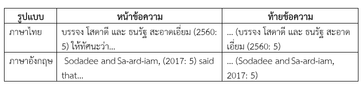 3.14 เอกสารอ้างอิง (References) ใช้การอ้างอิงแบบแทรกในเนื้อหา (In-Text Citation) ตามหลักเกณฑ์ APA (American Psychological Association) เป็นการอ้างอิงแหล่งที่มาของข้อความไว้ในเครื่องหมาย วงเล็บ ( ) แทรกในเนื้อหา ซึ่งมีรูปแบบการเขียนอ้างอิงที่นิยมแพร่หลาย โดยมีกฎเกณฑ์การอ้างอิงที่ออกแบบมาเพื่อให้ผู้ใช้มีความชัดเจนในการลงรายการงานเขียนต่างๆ ที่ง่าย ทันสมัย ถูกต้อง การอ้างอิงเอกสารที่เป็นภาษาไทยหรือภาษาต่างประเทศที่มิใช่ภาษาอังกฤษ ให้ผู้นิพนธ์บทความแปลเป็นภาษาอังกฤษอย่างถูกต้อง เป็นรูปแบบเดียวกัน และเรียงลำดับตามตัวอักษร A-Z (ห้ามอ้างอิง References ที่ไม่ปรากฏการอ้างอิงในเนื้อหาบทความ) (ห้ามอ้างอิง References ที่ไม่ปรากฏในเนื้อหาบทความ) (หัวข้อ TH Sarabun PSK ขนาด 18 pt, ตัวหน้า ชิดซ้าย, ส่วนเนื้อหา ขนาด 16 pt. ตัวธรรมดา, กระจายแบบไทย)