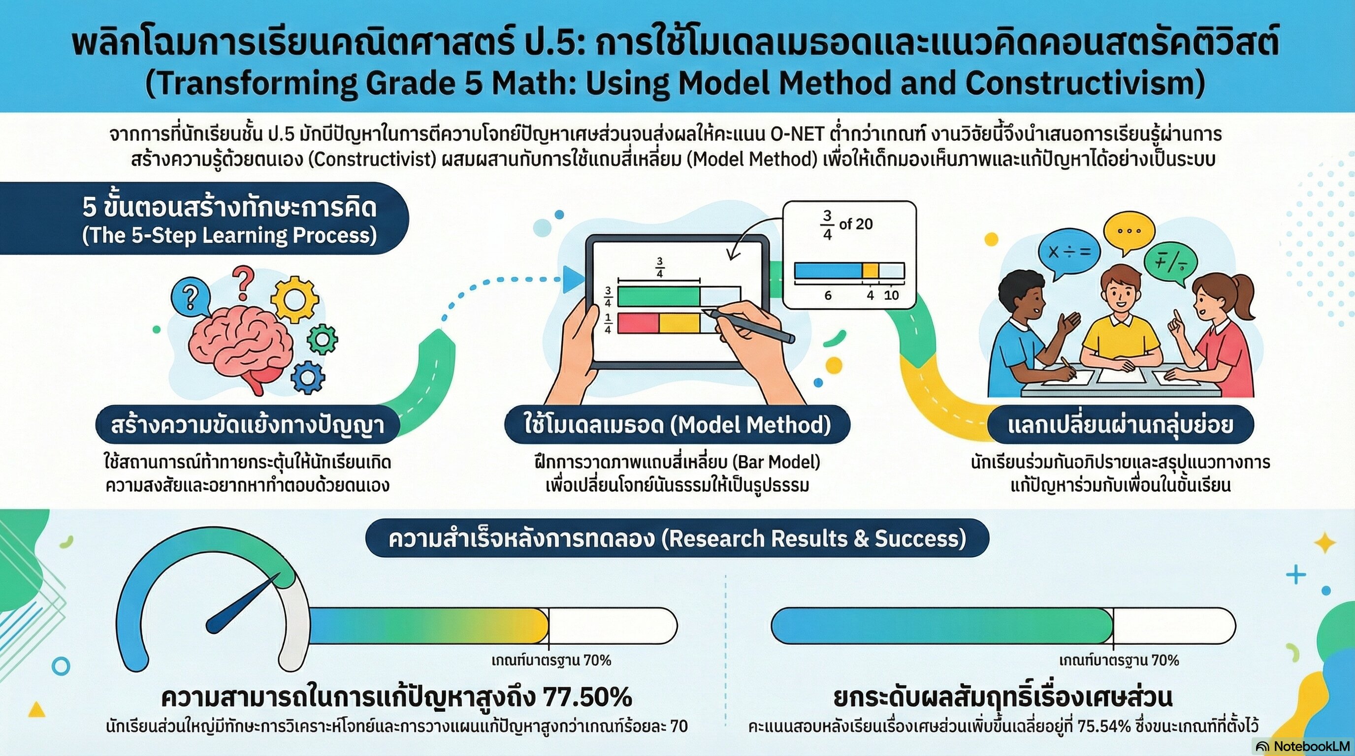 ผลการจัดกิจกรรมการเรียนรู้ตามทฤษฎีคอนสตรัคติวิสต์ร่วมกับโมเดลเมธอดที่มีต่อความสามารถในการแก้ปัญหาทางคณิตศาสตร์และผลสัมฤทธิ์ทางการเรียนคณิตศาสตร์ ของนักเรียนชั้นประถมศึกษาปีที่ 5