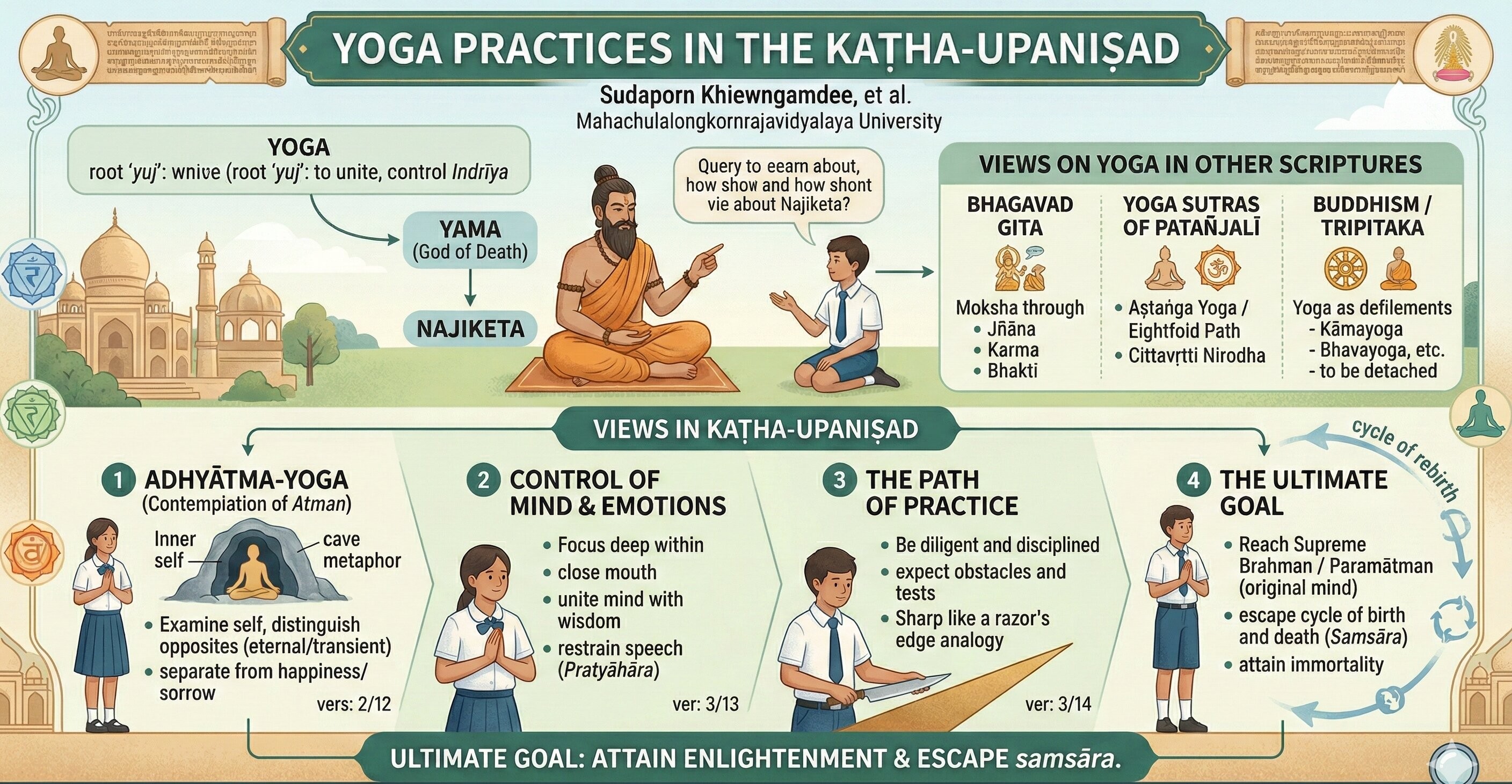 The ultimate goal of yoga is to escape from the cycle of birth and death. Yoga in the Upaniṣads emphasizes the Ātman, Jivātman, Paramātman and Brahman. It is a practice that uses the mind to control the Indrīya (consciousness). The Kaṭha-Upaniṣad, one of the 108 Upanishads, contains many interesting Hindu philosophical teachings, especially on yoga or meditation. The content of the scripture tells the story through two people: Yama as the teacher and Najiketa as the listener. Yama explains how to meditate to examine oneself, to distinguish opposites from each other, to control emotions and senses, to focus inward, to restrain speech, to unite the mind with wisdom, and to have the ultimate God, Brahman, as the goal. Most importantly, practicing yoga requires diligence and discipline. Practitioners will have to face many tests and obstacles before finding the path to success, which is the attainment of enlightenment.