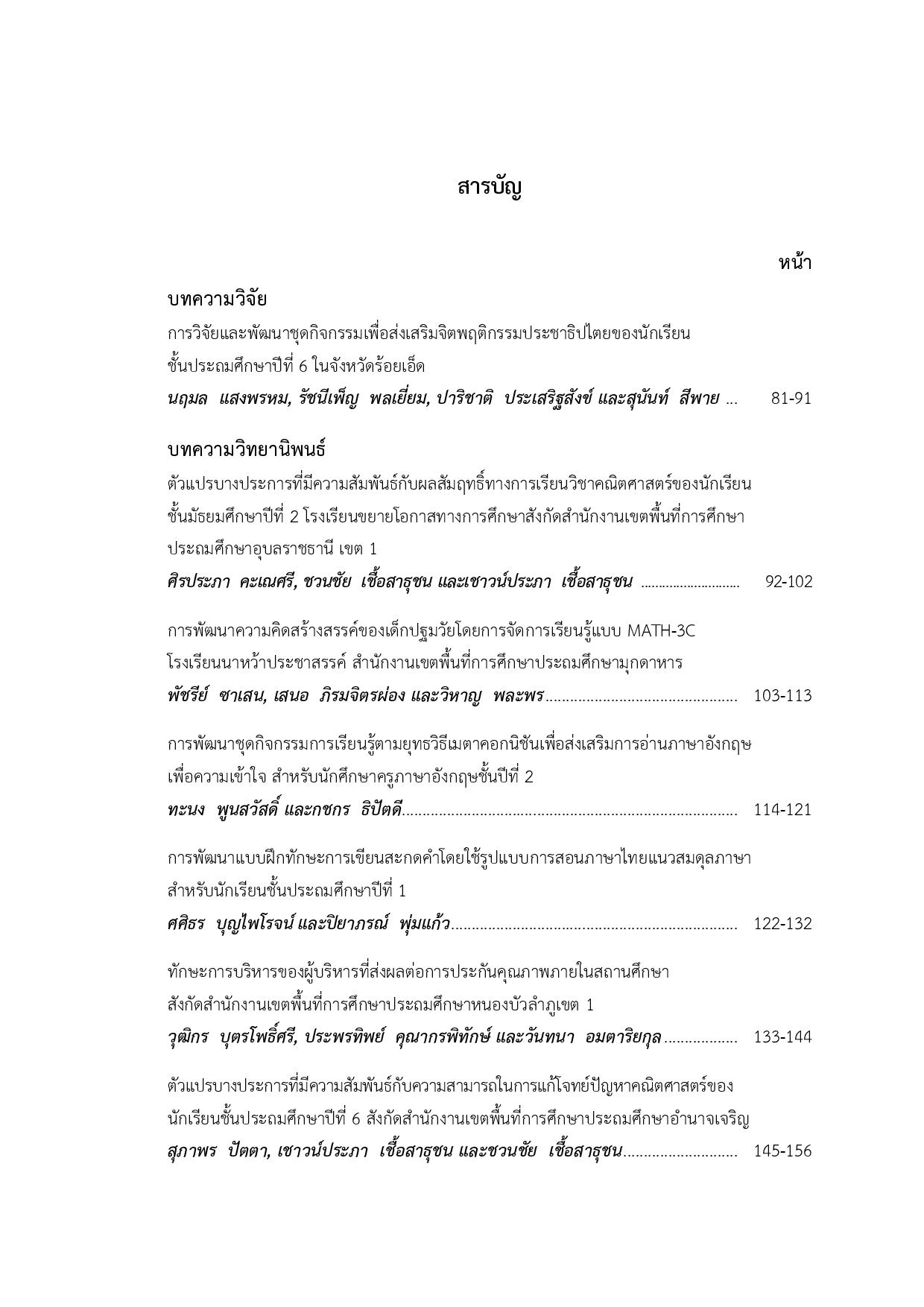 วารสารวิจัยและประเมินผลอุบลราชธานี ได้ดำเนินการจัดทำมาถึงปีที่ 8 แล้ว โดยมุ่งเน้นในศาสตร์ทางการวิจัย การวัดและประเมินผลทางการศึกษา ซึ่งวารสารได้รับการคัดเลือกเข้าสู่ฐานข้อมูล TCI จากศูนย์ดัชนีการอ้างอิงวารสารไทย (ศูนย์ TCI) โดยถูกจัดคุณภาพให้เป็นวารสารกลุ่มที่ 2 วารสารฉบับนี้มีบทความทั้งหมดจำนวน 7 บทความ แบ่งเป็นบทความวิจัย จำนวน 1 บทความ และบทความวิทยานิพนธ์ จำนวน 6 บทความ เป็นบทความจากหน่วยงานภายในมหาวิทยาลัย จำนวน 5 บทความ ภายนอกมหาวิทยาลัย จำนวน 2 บทความ ซึ่งทุกบทความได้รับการพิจารณาจากผู้ทรงคุณวุฒิประจำวารสารมาอย่างถูกต้องแล้ว หวังว่าจะเป็นประโยชน์ต่อผู้สนใจในวงการศึกษาต่อไป
